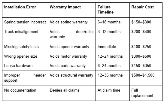 Seven installation mistakes void garage door warranties: incorrect spring selection, improper track alignment, missing safety features, wrong opener pairing, inadequate structural support, skipped torque specifications, and incomplete documentation.